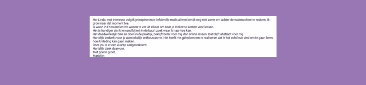 Op dit moment biedt mijn online leeromgeving mij nieuwe groeimogelijkheden. Hierdoor kan ik niet alleen jou voorzien van online naailessen, maar ook die vriendelijke dame in Groningen, Maastricht of Eindhoven.