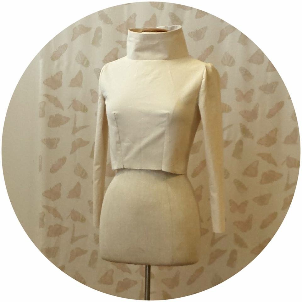 Tijdens de doorpas van het eerste proefmodel, bleek dat de ‘Crop top’ nog wel wat verder kon worden ingekort. Het opstaande boordje wat lager mocht en dat de bruid meer ruimte nodig had bij de schouder en mouw.