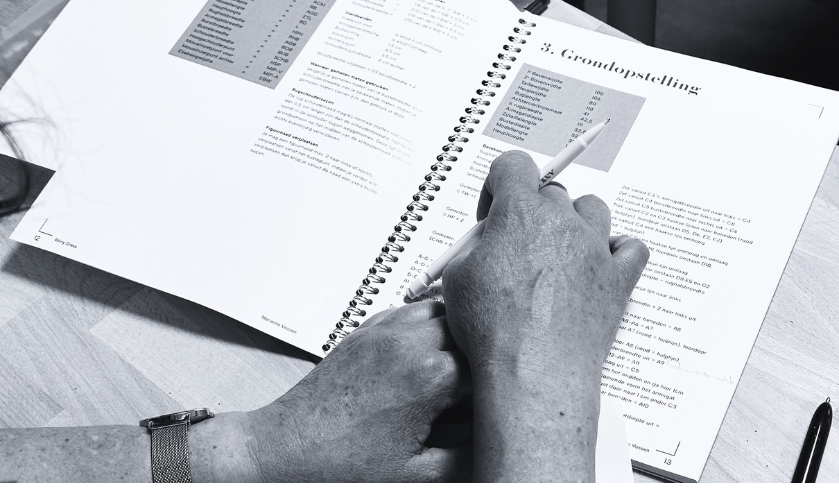 Pas daarna bepaal ik of dit past bij mijn figuur en stijl? En zo ja, dan teken ik het patroon stap voor stap op míjn eigen maten met het voorbeeld uit het naaitijdschrift ernaast.